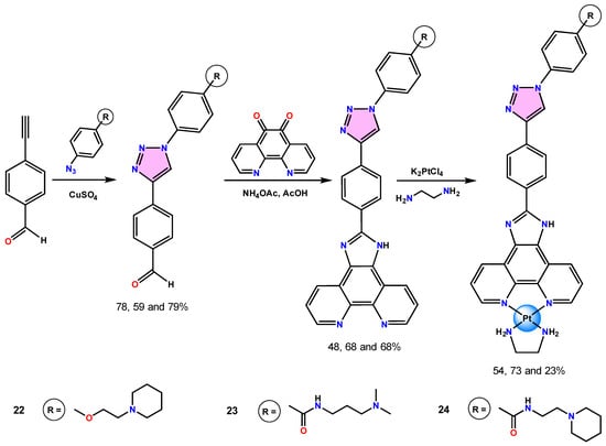 Chicago/Turabian StyleHernández-Romero, Delia, Sharon Rosete-Luna, Enrique Méndez-Bolaina, Elena de la C. Herrera-Cogco, Luis P. Amador-Gómez, Anell Soto-Contreras, José M. Rivera-Villanueva, and Raúl Colorado-Peralta. 2024. "Importance of the CuAAC Reaction in the Synthesis of Platinum Complexes with 1,4-Disubstituted-1H-1,2,3-triazoles: A Review of Their Anticancer Activity" Reactions 5, no. 4: 947-983. https://doi.org/10.3390/reactions5040050