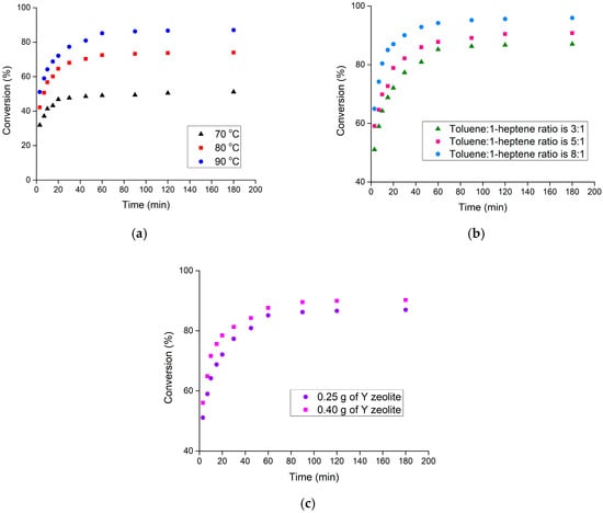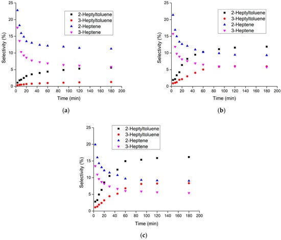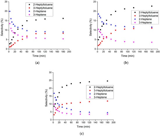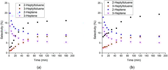 - Magnoux, P.; Mourran, A.; Bernard, S.; Guisnet, M. Influence of the acidity and of the pore structure of zeolites on the alkylation of toluene by 1-heptene. Stud. Surf. Sci. Catal. 1997, 108, 107–114. [Google Scholar]
