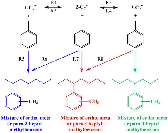 - Da, Z.; Magnoux, P.; Guisnet, M. Liquid phase alkylation of toluene with 1-heptene over a HFAU zeolite: Evidence for transalkylation between toluene and non-desorbed products. Appl. Catal. A Gen. 1999, 182, 407–411. [Google Scholar] [CrossRef]