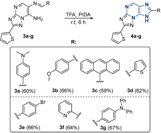The next step was the oxidation of the obtained imines 3a–g into the corresponding azolopurines. As in the previous step, we conducted an optimization of oxidation reaction conditions using different oxidizing agents. The results are summarized in Table 2.