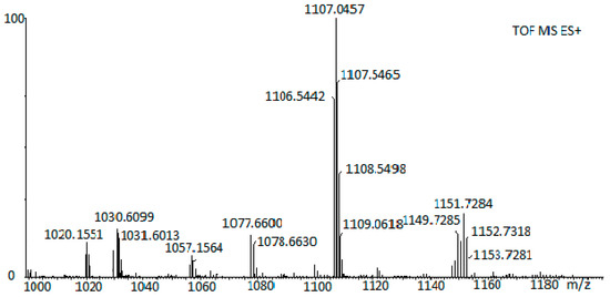 The 13C NMR spectrum of the Bu2Sn(TFMPP) complex showed characteristic peaks for ring carbon atoms of TFMPP and butyl groups. Carbons for both rings and butyl groups appeared at 151.15, 145.83, 138.70, 132.08, 128.31, 125.41, 121.48, 109.99, 35.35, 30.12, 26.84, 26.26, 13.47 ppm (Figure S3). These values are very characteristic of metal-bonded substituted-porphyrin complexes [40,41]. 1H NMR and 13C NMR spectra of other tin porphyrin compounds are given in the Supplementary Section (Figures S4–S24). HRMS measurement of [Bu2Sn(TFMPP)] gave an exact mass of 1151.7284 g/mol for [M + CH3OH + H]+ (Figure 2). The calculated molecular weight of this complex with methanol and proton (H+) is 1151.2580 g/mol. Since the complex is dissolved in methanol during the mass measurement, it binds methanol to its structure. The good agreement between the measured and calculated results confirms the pure synthesis of the complex and the accuracy of the proposed formula. The complex [Bu2Sn(TFMPP).CH3OH] (m/z = 1150.2502 g/mol) showed a parent ion peak at 1107.04557 Da for the [(C4H9)(CH2)Sn(TFMPP).CH3OH]+ ion obtained by removing the propyl unit (-CH2CH2CH3) from the butyl group. The other peak at 1077.6600 Da corresponds to the loss of methanol from the complex and gives the ion [(C4H9)(CH2)Sn(TFMPP) + H]+. As shown in Figure 2, fragmentation continues in a similar manner. The mass spectrum of the Bu2Sn(TMAPP) complex gave the parent ion peak at 1057.15 Da [exact mass for Bu2Sn(TMAPP). 2H2O + 3H+ is 1057.4878] as shown in Figure S25. It is clear from MS measurements that such large molecules can bind some solvent methanol or water molecules to their structure during the synthesis or mass measurements. Mass spectra of similar compounds containing porphyrins gave parent ion peaks and fragmentation peaks similar to the fragmentations in this study [42].