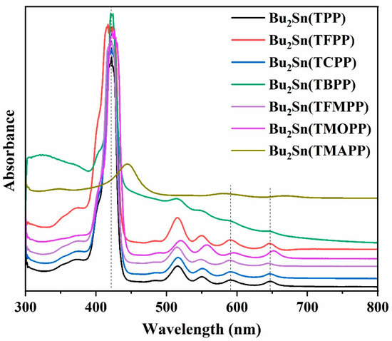 The UV-visible absorption spectra of Bu2Sn(TXPP) complexes.