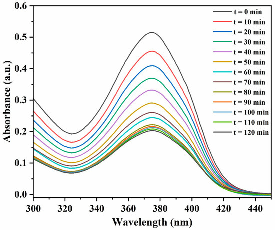 where Co and Ce are the initial and equilibrium concentrations (mg/L) of TTC antibiotics in the liquid phase, respectively [34]. In Equation (2), V is the volume of 10 mg/L tetracycline solution used, and m represents the quantity of Bu2Sn(TMOPP) adsorbent. The methoxyporphyrin compound (0.5 g/L) was mixed with 10 mg/L of TTC aqueous solution and stirred at 35 °C. After certain intervals (0, 20, 40, 60, 80, 100, and 120 min), 5 mL of the solution was removed from the mixture and centrifuged. Then, the supernatant was analyzed using a UV–Vis spectrophotometer.