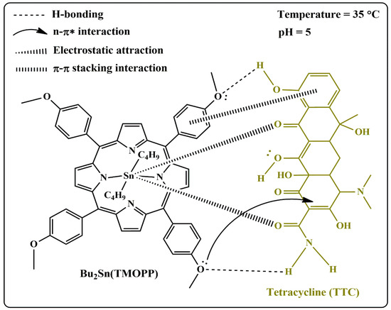 Scheme 3 shows the adsorption interactions between Bu2Sn(TMOPP) adsorbent and tetracycline antibiotic. The first interaction is hydrogen bonding, which occurs between the methoxy groups (-OCH3) in the Bu2Sn(TMOPP) adsorbent and the hydroxy groups (-OH) in the TTC antibiotic molecule. The second interaction is electrostatic attraction, which occurs between the positive tin atom in the center of the Bu2Sn(TMOPP) adsorbent and the negative oxygen atoms (-O) of the TTC antibiotic. The third interaction is the presence of nonbonding electrons in the methoxy groups in the porphyrin compound, and the empty π* orbitals in the TCC molecule can provide active sites for TTC adsorption by n-π interaction [50,55]. The fourth interaction is the π-π stacking interaction between the π orbitals in the phenyl groups in the porphyrin compound and the π orbitals in the TCC molecule.