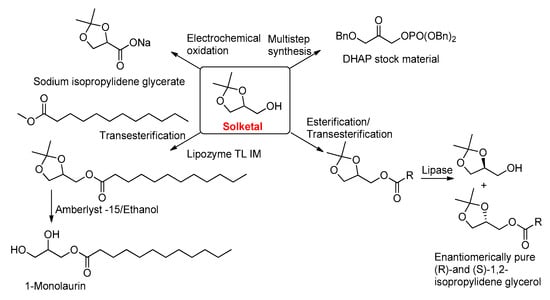 At present, extensive research is being carried out in academia and industries with regard to the utilization of glycerol to synthesize a wide range of value-added products [7,8,9,10,11,12]. In line with this, glycerol carbonate preparation is being explored as an important candidate for the synthesis of various polymers and bio-NIPUs (biobased non-isocyanate polyurethanes) [7]. Moreover, glycerol can also be converted into solketal (isopropylidene glycerol)—a commercially available chemical compound. Solketal has various applications as a solvent, fuel additive, and starting material for many chemical compounds, such as mono-glycerides (Figure 1) [13,14,15,16,17,18,19,20,21,22]. Mono-glycerides are widely used in the food, nutraceutical, cosmetic, and life sciences industries.