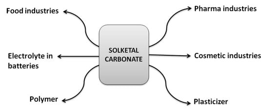 To further expand the scope of glycerol utilization via the solketal route, it can be converted into solketalcarbonate, which has several industrial applications (Figure 2) (Scheme 1) [23]. Recent research shows that solketal carbonate-based liquid electrolyte is of immense interest and is being investigated for application in potassium batteries [24]. The experimental results indicate that solketal carbonate-based liquid electrolyte displayed stable electrochemical behavior and performance close to those of commercially available oil-derived alternatives [24].