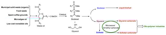 A conceptual representation of an organic waste-based biorefinery for producing biodiesel, glycerol carbonate, and solketal carbonate. (Me—methyl group).