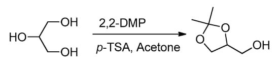 Glycerol (30 mmol, 3 g), 2,2-DMP (2,2-dimethoxypropane) (45 mmol, 4.6 g), acetone (30 mL), and a catalytic amount of p-TSA (Para-toluene sulfonic acid) (10 mg) were stirred at room temperature for 24 h. Afterwards, residual reactants (acetone and 2,2-dimethoxy propane) were separated under a vacuum. The few remaining impurities in the reaction mixture were removed by silica gel column chromatography using ethyl acetate–n-hexane (5:95) as an eluent. Solketal was isolated in 86% yield (3.72 g) as a colorless oil. Characterization of the product was performed as reported earlier [18].