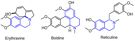 The tetrahydroisoquinoline moiety is a privileged scaffold in one of the largest classes of alkaloids, known for their diverse biological effects and particularly complex structures, such as the following: Erythrina alkaloids, for example erythravine, 11-α-hydroxyerythravine, and 11-α-hydroxyerysotrine have an anxiolytic effect. Additionally, erysodine is a competitive antagonist of neuronal nicotinic acetylcholine receptors nAChRs and moderates radical scavenging activity. Eysovine, erysotrine, erythraline have an insecticidal activity [3]. Aporphine alkaloids, such as boldine, magnoflorine, nuciferin, and thaliporphine, decrease intestinal glucose absorption and also the fasting blood glucose level, improve glucose metabolism, stimulate insulin secretion, and therefore prevent type 2 diabetes mellitus and other components of metabolic syndrome [4]. Apomorphine–D1 and D2 are dopamine agonists used for Parkinson’s disease treatment, meanwhile glaucine is a bronchodilator, antitussive and a psychoactive substance [5,6]. In addition, Protoberberine alkaloids namely tetrahydropalmatine has an analgesic and sedative effects and is used in anti-cocaine addiction medication [7]. Benzyltetrahydroisoquinoline alkaloids for instance reticuline, a dopamine receptor antagonist has a central nervous system depressing effect [8]. Additionally, (+)-laudanosine, which shows affinity for various neuronal receptors such as GABA, opioids, and nAChRs, has shown potential as treatment for various CNS disorders such as depression, schizophrenia, Alzheimer’s, and Parkinson’s diseases [9,10,11]. Furthermore, bisbenzyltetrahydroisoquinoline alkaloids, like (-)-antioquine has an anti-Trypanosoma cruzi activity [12], D-(+)-tubocurarine is a non-depolarizing neuromuscular blocking agent [13]) and Morphinan alkaloids in particular morphine and codeine have analgesic and antitussive effects [13]). It is also worth mentioning Saframycin alkaloids namely Saframycins, Safracins, and Renieramycins, are natural antibiotics with antiproliferative and antimicrobial activities [14,15,16], Ecteinascidin alkaloids like Ecteinascidin ET-743 with commercial name Trabectedin/Yondelis, is a DNA alkylating agent of specific nucleotide sequences in the minor groove, approved in combination with other antitumor drugs for the treatment of several types of soft tissue sarcomas [15,17,18], Pavine and Isopavine alkaloids e.g., (-)-argemonine, is a protein kinase inhibitor and potential anticancer drug, and neocaryachine and its derivatives which have antiarythmic properties [19,20]. Not to mention Quinocarcin alkaloids e.g., quinocarcinol, tetrazomine as antitumor agents [13,21]), Phtalide-tetrahydroisoquinoline alkaloids e.g., noscapine, which has antitussive and antitumor activities) [22,23], or other known compounds such as emetine, an anti-protozoal, and potential chemotherapeutic agent [9,22,24] (Figure 1). For these reasons, the 1,2,3,4-tetrahydroisoquinoline ring system has attracted much attention in the scientific community, leading to the development of many synthetic analogues that possess a wide spectrum of biological properties, such as OX1 and/or OX2 orexin receptor ligands with potential in the treatment of sleep disorders [25]; D1 and/or D2 dopamine receptor ligands with potential in the treatment of psychiatric and neurological disorders [26,27], neuroprotective effect in Parkinson’s disease [28], antidepressant activity [29]; and acetyl- and butyrylcholinesterase inhibition and their potential as anti-Alzheimer agents [30], anti-inflammatory properties [31], antitumor activity [32,33], antispasmodic effect [34], anti-tuberculosis activity [35], antibacterial activity against both Gram-positive and Gram-negative bacterial strains [36], anf finally antiviral activity [37] among others.