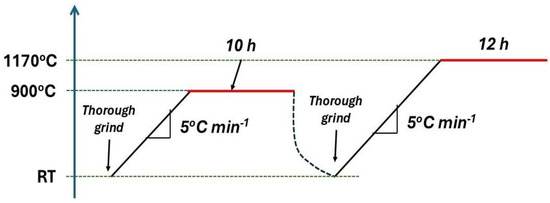 Niobium-based catalysts, promoted with group I elements (Na, K), were prepared by a standard solid-state chemistry methodology [24]. In that case, Nb2O5 (CBMM, Araxá, Brazil, 99%) and X2CO3 (X = Na, K) (Êxodo, Sumaré, Brazil, 99%) powders were mixed at a 1:1.05 (Nb:X) atomic ratio (group I element 5% atomic excess) and thoroughly ground together in a mortar. Next, the mixtures were heat-treated in a muffle furnace by ramping the temperature at 5 °C min−1 up to 900 °C and keeping it over 10 h. After cooling down and a further thorough grinding step, the samples were again ramped at 5 °C min−1 up to 1170 °C and kept at that temperature over 12 h, as depicted in Figure 1.