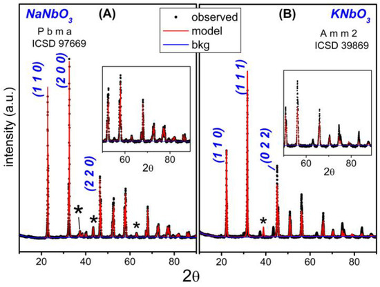 Figure 2. Rietveld refined XRD patterns of the alkaline niobate photocatalysts, considering orthorhombic NaNbO3 (ICSD 97669) (A) and KNbO3 (ICSD 39869) (B) phases as model structures. Insets: 38–90° region of the patterns to emphasize the match between the experimental and theoretical patterns. NiO phase-related peaks are indicated by asterisks (*).