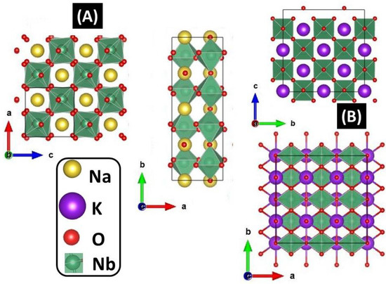 Fully relaxed geometries for NaNbO3 and KNbO3 were obtained theoretically, as depicted in Figure 3. For both structures, the computed theoretical lattice parameters agree with the experimental data (obtained from Rietveld refinement) within 1% of discrepancies. Furthermore, the finding is in good agreement with experimental [48,49,50,51] and theoretical [50,52] previously reported results.