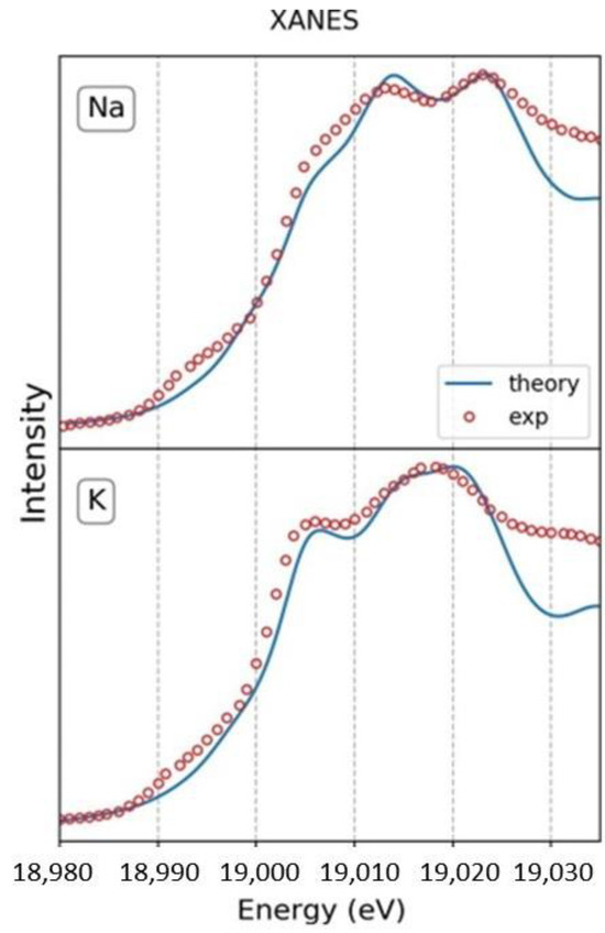 Quantum mechanical calculations were performed using density functional theory (DFT), where the exchange-correlation term was described within the generalized gradient approximation as proposed by Perdew, Burke, and Ernzerhof (GGA-PBE) [34]. The electron–ion interactions were described using the Projector Augmented Wave (PAW) method [35]. The plane wave cutoff energy was set to 60 Ry, and the Monkhorst–Pack scheme [36] was used with a mesh of the 4 × 2 × 4 (4 × 4 × 4) k-points for the Brillouin zone integration for NaNbO3 (KNbO3). The geometric structures were fully relaxed, considering a convergence for the atomic forces on each atom smaller than 0.025 eV/Å. To better describe the band gap, the exchange-correlation functional was treated using the hybrid Hyed–Scuseria–Ernzerhof (HSE06) functional [37] in a single point calculation of the electronic structure. Additionally, the optimized structures of the XNbO3 were used to simulate XAS spectra. The theoretical Nb K-edge XANES spectra were obtained via computational simulation using the approach as implemented in XSpectra code [38,39,40], supplied with Quantum Espresso [41] packages, and GGA-PBE functional.