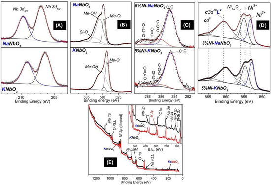 The samples were analyzed by XPS to evaluate likely changes in surface structure/composition as a function of the nature of the alkaline metal present in those niobates. The obtained spectra are displayed in Figure 5. The Nb 3d region, shown in Figure 5A, is represented by two sharp peaks located in ca. 207 eV and 210 eV (3d5/2 and 3d3/2, respectively), for Nb(V) species [55]. Those energies are observed in both samples, which indicate the 5+ oxidation state of Nb located at the surface is presented in either samples, regardless if it is NaNbO3 or KNbO3. Some oxygen-related peaks are observed (Figure 5B) and are typical of oxygen species in transition metal oxide surfaces [56], while the peak located at 532 V, has been related to SiO2 [57]. The presence of Si from the substrate at the surface of the samples is confirmed by the Si 2s and 2p related peaks (see the survey spectrum, Figure 5D). Carbon atoms are a ubiquitous surface impurity [58] that may come from the air (as CO2 and hydrocarbons). Further important sources of adsorbed carbon were the isopropanol adsorption debris originating from the sample preparation procedure. Those impurities were then expected to be restricted to only a few Angstroms beneath the surface in a very small concentration, for it should not influence the bulk-related electronic structure of these oxides. Regarding the carbon-related 1s peak, the multiplicity of peaks further than the expected for sp3 carbon (set to be 284.8 eV, as an internal standard) indicate that different types of carbon containing adsorbates were present on the surface of the niobates. In all niobates, two peaks located at higher binding energies than the sp3 carbon 284.8 eV were observed: one at ca. 286–287 eV and another at 288 eV. The former peak range encompasses carbon linked to oxygen in single bonds (C–O groups). Peaks located at farther BE’s may be correlated to C–O groups (surface carbonates, carbonyls) [59,60]. Those enlarged carbonate-related peaks indicate the presence of stronger basic sites for the adsorption of carbonates. The Ni 2p region is represented by four broad peaks located within the 845–870 eV binding energy region. Those peaks represent 2p3/2 (ca. 850 eV) and 2p1/2 (ca. 860 eV) peaks, as well as their broad satellites, which may be related to the interaction between the 2p photoelectrons with valence electrons. In fact, given the complexity of this region and the breadth of the 2p1/2-satellite system, only the 2p3/2-satellite peak system has been most frequently discussed in literature [61]. When a core hole is formed in NiO, the system will tend to minimize the repulsion between the core and Ni 3d vacant orbitals by the formation of a hole in the ligand valence band (oxygen 2p orbitals). This generates the so-called cd9L level in NiO, where “c” and “L” mean holes in Ni 2p core and the valence ligand levels, respectively. A second ligand-to-metal charge transfer related cd10L2 level is also observed. The unscreened cd8 level will tend to occur a few eV above the formerly described screened levels, although at a much lower probability [62]. In NiO XPS, those events are represented by peaks at 854.6 eV and 861 eV [63] and 865 eV [62], respectively. The main peaks located at 853.5 eV and 855 eV in both samples have been related to the presence of Ni2+ and Ni3+ in non-stoichiometric NiO [64,65,66,67,68]. In this sense, the fact that the relative intensities of the Ni2+ and Ni3+ related peaks (at c.a. 853.5 eV and 855 eV, respectively) are different, indicates that Na, rather than K, is somehow interacting with the NiO phase, inducing Ni3+ related defects in the NiO phase, probably by forming a Na-doped NiO phase [69,70,71].