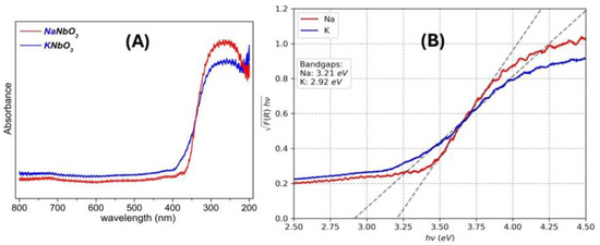 To investigate the optical properties of the alkaline niobates, UV-vis diffuse reflectance spectroscopy (DRS) was carried out. The experimental optical bandgap may be extracted from a [F(R)hv]n vs. hv plot at lim([F(R)hv])n = 0 according to Kubelka–Munk formalism [72,73], as the following: