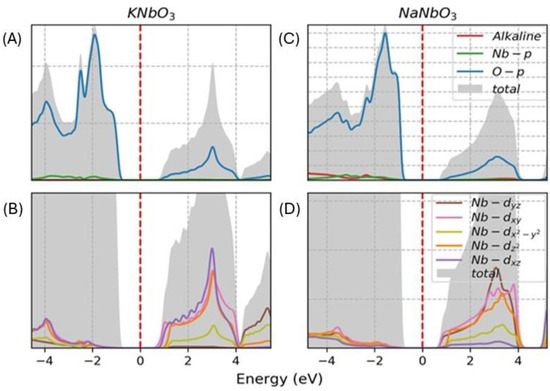 Figure 7. Projected density of states for Niobates, considering GGA-PBE approximation. The total density of state and p-projections of (A) KNbO3 and (C) NaNbO3. Nb-d orbital projection for (B) KNbO3 and (D) NaNbO3. The Fermi level is set at zero.
