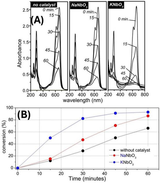 Figure 9 displays the MB conversion over the reaction time, as monitoring of the 664 nm absorption peak. The photocatalytic activities of the niobates followed the order KNbO3 > NaNbO3, in comparison to the control test, which was performed without a photocatalyst. It is worth noting that without the catalyst, the MB is decolored after one hour with a conversion of 65%. However, the presence of the catalyst (NaNbO3 or KNbO3) increases the conversion rate. The fact that KNbO3 as a photocatalyst was more active than NaNbO3 is consistent with other works [1,79,80,81].
