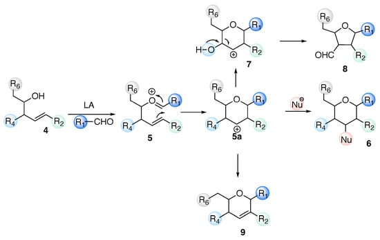 There is currently a wealth of inter and intramolecular Prins reactions available within the modern synthetic chemist’s “toolbox.” However, among the most prevalent Prins reaction types is the addition of a nucleophiles to a secondary carbocation (typically alkenes or alkynes), pinacol-type rearrangement, Sakurai–Prins reaction, and Ritter–Prins reaction. Within the context of sugar moiety synthesis via Prins cyclization and based on the origin synthon of homoallylic alcohols, these reactions are divided into two distinct subclasses: those in which a synthesis of carbohydrate scaffolds from carbohydrate synthons (2) and those in which a carbohydrate scaffolds from non-carbohydrate synthons (3).