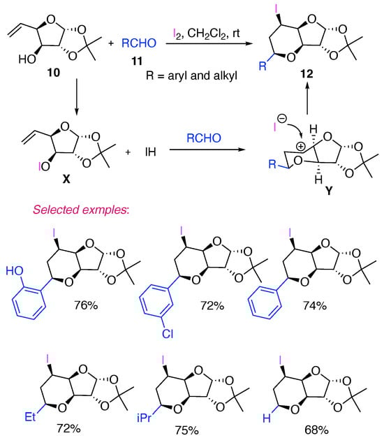 This section summarizes research that focuses on generating valuable carbohydrate scaffolds or structural units using carbohydrate-derived starting materials, particularly carbohydrate-derived homoallylic alcohols, through a process called Prins cyclization. In this specific study conducted by Yadav and colleagues, they reported [47] the synthesis of a sugar-annulated iodotetrahydropyran compound 12 by employing Prins cyclization. They combined a D-glucose-derived homoallylic alcohol 10 with an aldehyde 11 in their synthetic approach (Scheme 2). The researchers explored the use of a variety of aromatic and aliphatic aldehydes as reactants in their experiments. Importantly, they successfully obtained the desired products in moderate to good yields, indicating the effectiveness of their synthesis method. The authors of this study proposed a reaction mechanism that involves an intermediate X and a highly reactive carbocation Y. This carbocation Y is subsequently captured by an iodide ion, resulting in the formation of the sugar-annulated iodotetrahydropyran compound 12.