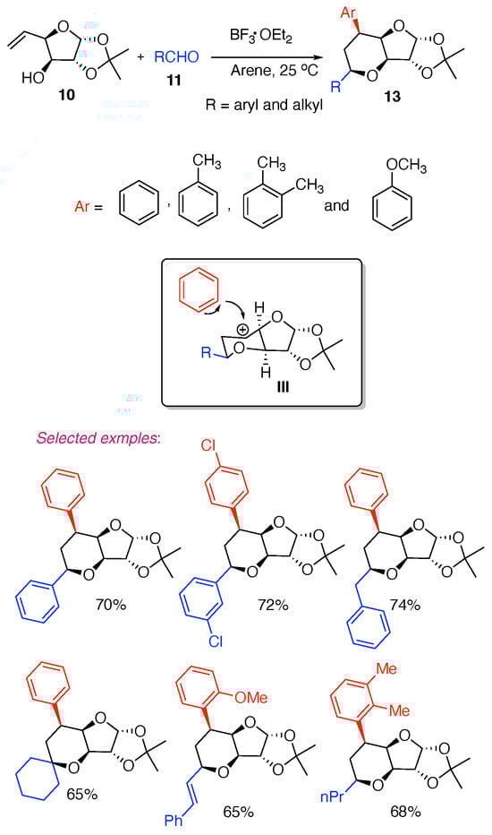 In a subsequent study, the same research group [48] conducted an in-depth investigation of the Prins/Friedel–Crafts cyclization of homoallylic alcohol 10, as illustrated in Scheme 3. They explored the reaction of a homoallylic alcohol 10 derived from D-glucose with various carbonyl compounds 11, using benzene as the solvent and a catalytic amount of BF3·OEt2 (0.1 equiv). The reaction proceeded efficiently at 25 °C, yielding the corresponding sugar-fused diaryl hexahydro-2H-furo [3,2-b]pyran 13 via intermediate III in good to excellent yields, with complete cis-selectivity (Scheme 3).