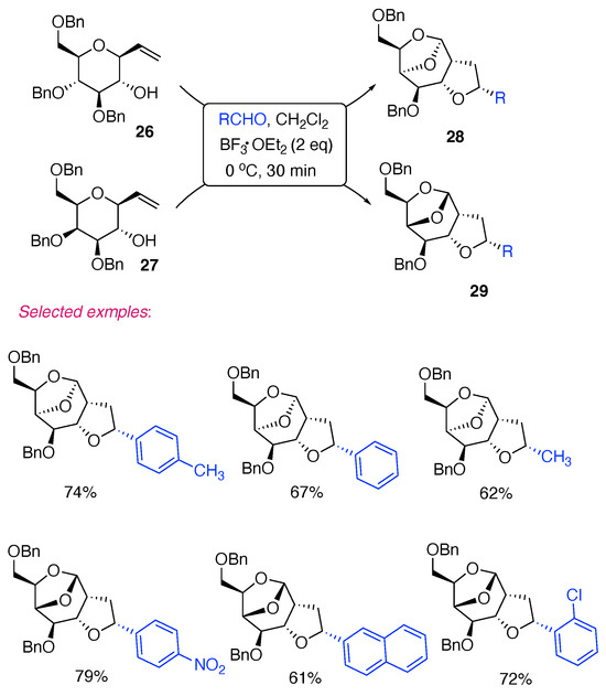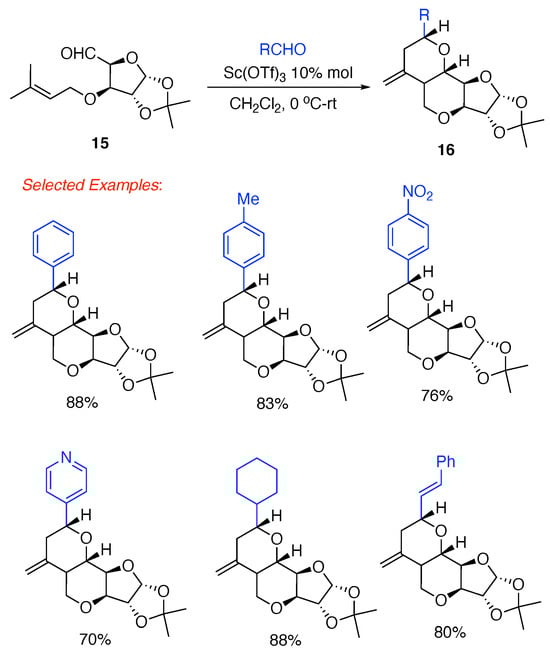 Reddy et al. reported [49] the synthesis of the hexahydro-2H-furo [3,2-b]pyranopyran scaffold 16 from O-prenyl tethered carbohydrate-derived aldehyde 15 with various aldehydes in the presence of 10 mol% Sc(OTf)3 in dichloromethane at 0 °C to room temperature (Scheme 5). Further, this reaction was studied with a variety of aryl and alkyl aldehydes. Eventually, this reaction was quite successful with p-bromobenzaldehyde and cyclohexylidene protected O-prenyl tethered carbohydrate-derived aldehyde to furnish the product tricyclic sugar derivative 16 (Scheme 5).