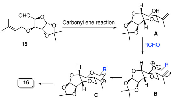 First, cyclization of O-prenyl tethered carbohydrate-derived aldehyde 15 is proposed, facilitated by carbonyl ene reaction and led to homoallylic alcohol A, with this being the Prins reaction defining step. Then A condes with aldehyde in presence of Sc(OTf)3 could give tertiary carbocation C via oxocarbenium ion B. Further C could eliminate proton from methyl group and led to product 16 (Scheme 6).