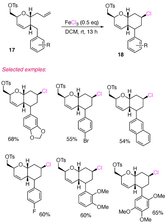 In 2014, Lumba and Mukherjee [50] developed a practical protocol for the conversion of tri-O-acetyl-D-glucal-derived 2-C-branched sugars 17 to the corresponding cis-1-oxadecalines 18. By using FeCl3 as a catalyst system at room temperature, the target molecules could be afforded (Scheme 7). The advantages of this protocol are the use of a variety of 2-C-branched sugars.
