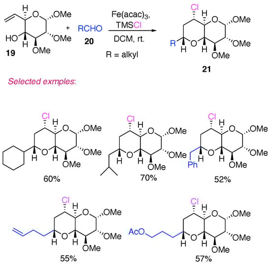 Padrón and co-workers [51] reported a simple preparation method for trans-fused bicyclic tetrahydropyran 21 by iron(lll) catalyzed tandem reaction using tri-O-acetyl-D-glucal-derived homoallylic alcohol 16 and iso-valeraldehyde (Scheme 8). This reaction was further studied with more complex molecule 19, which is derived from a-methyl-D-glucopyranoside with aldehydes and led to the trans-fused bicyclic tetrahydropyrans 20. Here, the features are the good substrate generality and the mild reaction conditions.
