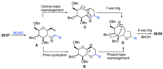 Vankar and co-workers [53] developed an efficient synthesis of bridged tricyclic ketals 28/29 with good substrate generality starting from homoallylic alcohols 26/27 derived from 1,2-anhydro and aldehydes; they used BF3·OEt2 as the catalyst (Scheme 10). Here, the main advantages include the stereoselectivity and good yields. They proposed the plausible mechanism for the formation of bridged tricyclic ketals 28/29. It is presumed(Scheme 11) that after initial formation of the oxocarbenium ion A, it can either undergo Oxonia-Cope rearrangement to form B or simply a π-cation cyclization to form C. Both of these intermediates will then undergo 7-exo trig cyclization or pinacol-type rearrangement via the transition state D, followed by cleavage of the C4-OBn participation resulting in the form of bridged tricyclic ketals 28/29. Later, these bridged tricyclic ketals were converted to (Scheme 12) tetrahydrofuran ring-fused heptose 31 and 2C-branched heptose 32.
