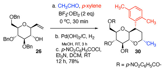 To gain further insights into the proposed mechanism, homoallylic alcohol 26 was treated with acetaldehyde using p-xylene as a solvent and two equivalents of BF3·OEt2 at 0 °C. After 30 min, the p-xylene-trapped product was observed (Scheme 13). This intermediate was then subjected to hydrogenolysis using Pd(OH)2/C, followed by benzoylation of the resulting alcohol with p-nitrobenzoyl chloride in the presence of Et3N, yielding the corresponding annulated sugar 30.