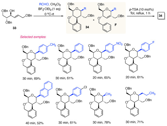 In 2017, Vankar et al. [54] reported an efficient synthetic route for the preparation of 1C-aryl/alkyl 2C-branched sugar-fused isochroman derivatives 34. The method involved the reaction of homoallylic alcohol 33 and various aldehydes in the presence of BF3·OEt2 in DCM, leading to the formation of 1C-aryl/alkyl 2C-branched sugar-fused isochroman derivatives 34 and intermediate F. Then, the crude reaction mixture was further treated with p-TSA in toluene, yielding exclusively the desired derivative 34. This process achieved moderate reaction times (1 h) with yields ranging from 60–70% (Scheme 14).