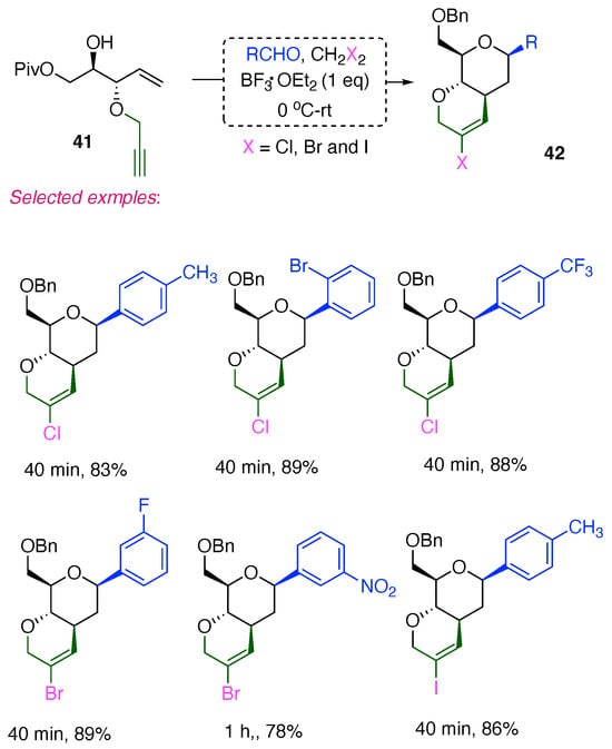 Using similar reaction conditions, but with a D-mannitol-derived homoallylic alcohol protected with a propargyl group, Dubbu and Vankar obtained [55] 1C-aryl/alkyl-fused bicyclic vinyl halide derivatives 42 in good to excellent yields. The halogen abstraction was achieved through the use of halogenated solvents. Depending on the solvent used—CH₂Cl₂, CH₂Br₂, CH₃I, etc.—the products obtained were 1C-aryl/alkyl-fused bicyclic vinyl chloride, vinyl bromide, or vinyl iodide derivatives, respectively (Scheme 18).