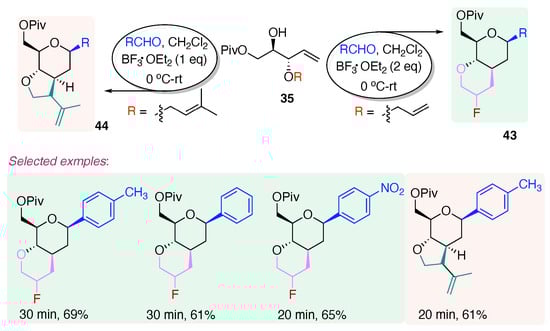 By applying similar reaction conditions, Dubbu and Vankar further transformed [55] the D-mannitol-derived homoallylic alcohol 35, protected with allyl and substituted allyl groups, to synthesize 1C-aryl/alkyl-fused bicyclic fluorine-substituted tetrahydropyran and furan derivatives 43/44, achieving good to excellent yields (Scheme 19).