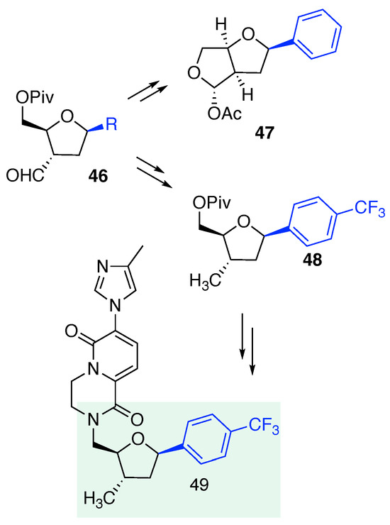 Furthermore, (Scheme 21) this method was effectively applied to synthesize a fused-bicyclic β-C-aryl furanoside moiety 47 and a 2,3-dideoxy-3C-methyl β-C-aryl furanoside 48, both of which are found in the core structures of bioactive molecules.