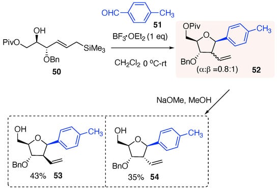 Later, Vankar and co-workers optimized (Scheme 22) the Sakurai–Prins reaction of a D-mannitol-derived homologated allylsilane homoallylic alcohol 48 with p-tolualdehyde 51 in the presence of BF₃·OEt₂ [56]. This reaction yielded 2-deoxy-2C-branched β-C-aryl furanosides in good yield (84%) as an inseparable diastereomeric mixture (α:β = 0.8:1 ratio) (Scheme 22). To separate the stereoisomers, compound 48 was subsequently deprotected at the –OPiv group using NaOMe/MeOH, resulting in diastereomers 53 and 54, which were then separated by column chromatography with yields of 43% and 35%, respectively.