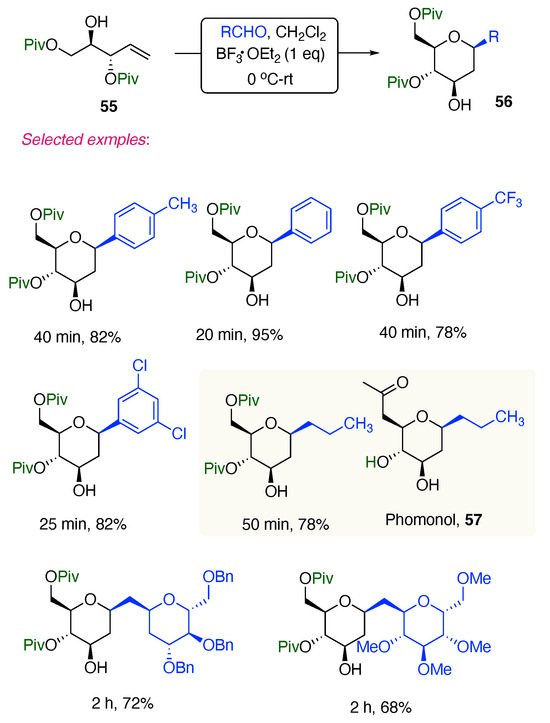 Vankar and co-workers further synthesized [57] a non-participating protecting group at allylic position of D-mannitol-derived homoallylic alcohol 55 and which was subjected to the Prins reaction with a vairy of aldehydes in the presence of BF3·OEt2 as a catalyst and led to stereoselective 2-deoxy-C-aryl/alkyl glycosides 56 (Scheme 23). The synthetic versatility of this approach has been demonstrated in the synthesis of C-disaccharide and O-linked disaccharides 58, and differently protected 2-deoxy-β-C-aryl glycosides 59,60 (Scheme 24).