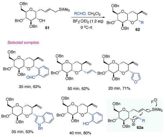 Furthermore, Vankar and co-workers reported [58] (Scheme 25) the synthesis of 1,2-annulated tetrahydropyran-fused sugar derivatives 62 via intermediate 62a by the reaction of a D-glucose-derived alcohol 61 with various carbonyl compounds in the presence of BF3 Et2O, via Prins cyclization. The obtained products were converted to more useful scaffolds cis-sugar-fused pyrano [3,2-c][1]benzopyran 63 and cis-sugar-fused 4H-naptho [1,2-b]pyran 64 (Scheme 26). Furthermore, they investigated the reaction in the presence of TMSOTf, where 1,2-annulated tetrahydrofuran-fused sugar derivatives 66 were obtained via intermediate 66a in moderate to excellent yields. This transformation occurred from D-glucose-derived homopropargyl alcohol 65 and several aldehydes (Scheme 27).