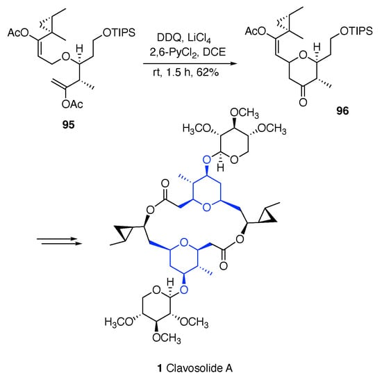 In 2012, Floreancig and Peh reported [28] a DDQ-mediated oxidative intramolecular Prins cyclization of compound 95, yielding sugar core 96 in moderate yield (Scheme 32). This reaction proceeds via a diene-type intermediate.