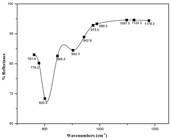 The FTIR spectrum of PBI.Mo catalyst was observed on a Thermal Nicolet Avectar 370 DTGS equipped(Thermo Electron) with a smart orbit accessory. A finely grounded sample of the catalyst was placed on the sample stage and the spectrum was recorded with the aid of OMINIC software. The PBI.Mo spectrum showed Mo=O and Mo-O-Mo vibrations characteristics with adsorption bonds around ~690 cm−1 to ~900 cm−1. Hence, the FTIR spectrum of PBI.Mo catalyst confirms the incorporation of Mo centres in polymer resin due to the presence of Mo=O and Mo-O-Mo features, as shown in Figure 3.