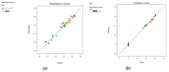 Actual experimental data versus predicted model of the yield of epoxide: (a) 1,2-epoxy-5-hexene, (b) 1,2-epoxy-7-octene.