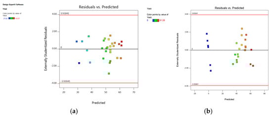The adequacy of the predicted models was checked by several statistical validations including the coefficient of correlation (R2), adjusted coefficient of determination (R2adj), and predicted coefficient of determination (R2pred). The statistical significance of the predicted models was analysed by ANOVA using Fisher’s test, i.e., F-test, at a 95% confidence interval. The statistical significance of the results was presented by p-value, where the result is significant when the p-value is less than 0.05. Design Expert 13 software (Stat-Ease Inc., Minneapolis, MN, USA) was used to perform the initial experimental design, model prediction, statistical analysis, and optimisation.