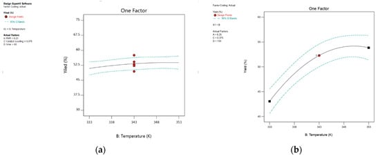The response analysis utilising BBD was implemented following the completion of the 29 experiments and the assessment of the yield of 1,2-epoxy-5-hexene and 1,2-epoxy-7-octene (reaction responses) for each run. By fitting the experimental results, the generic quadratic equation shown in Equation (1) was used to obtain a model of polynomial regression. The polynomial equations for the epoxidation of 1,2-epoxy-5-hexene and 1,2-epoxy-7-octene are shown in Equations (2) and (3).