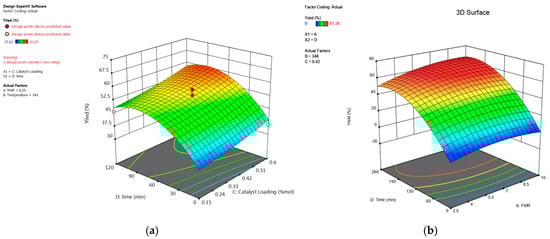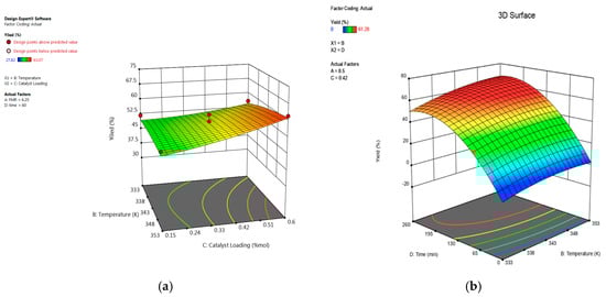 The effect of each independent process variable on the process response is investigated in this section. In addition, the interactive effect is highlighted on the response of various independent variables. Three-dimensional response surface plots were created for a model equation after constructing the regression model and evaluating the model adequacy. The 3D surface plots of the interaction between epoxide yield versus two independent variables are displayed. The two remaining independent variables are kept constant in their centre points in each plot. Three-dimensional response surfaces help in understanding system behaviour. Additionally, they help in identifying the reaction surface’s characters [48,49].