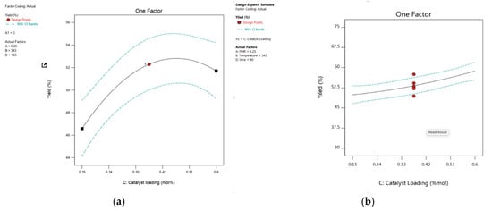 Catalyst loading is described in this study as a percentage of the mole ratio of Mo to TBHP. In this research, a single batch of the produced catalysts was used for batch investigations. The effect of catalyst loading for epoxidation with TBHP was investigated by conducting batch experiments using 0.15 mol% Mo, 0.375 mol% Mo, and 0.6 mol% Mo catalyst loading. Based on the ANOVA results presented in Table 2 and Table 3, the catalyst loading parameter shows a significant effect on the process response. As shown in Figure 13, it can be observed that the yield of 1,2-epoxy-7-octene increased along with the increase in catalyst loading, from 46.58% to a maximum of 52.87% at 0.45 mol% Mo catalyst loading. It gradually declined once the catalyst loading was increased to 0.6 mol%, demonstrating that the optimum catalyst loading was reached. Figure 13 also shows that a positive correlation exists between catalyst loading and the yield of 1,2-epoxy-5-hexene within the temperature range between 333 K and 353 K. The yield of 1,2-epoxy-5-hexene at 60 min was ~49% and ~59% for reactions conducted at 0.15 mol% Mo and 0.6 mol% Mo, respectively, while the FMR of 1,5-hexadiene to TBHP was 6.25:1. For example, Figure 14 shows that at a lower catalyst loading of 0.15 mol% Mo, only 48% of epoxide yield was recorded because of low 1,7-octadiene conversion at low catalyst loading. The epoxide yield increased steadily up to 67% as the feed molar ratio increased at moderate levels of catalyst loading from 0.15 mol% to 0.42 mol%. This phenomenon may be explained by an increase in the catalyst’s surface area, which increases the surface area available for contact between the catalyst’s active sites and the reactant, 1,7-octadiene [53]. The increase in catalyst loading from 0.15 mol% Mo to 0.42 mol% enhances the epoxide yield from 48% to 53.1% for lower feed molar ratios (for example, at 2.5:1). As seen in Figure 14, the yield of 1,2-epoxy-7-octene increases proportionally with catalyst loading at any designated value between 0.15 mol% and 0.42 mol%. A low p-value (0.0023) also provided support for this observation. Figure 14 shows that the yield of 1,2-epoxy-5-hexene at a feed molar ratio of 1,5-hexadiene to TBHP of 9.6:1 was ~47% and ~57% at 0.15 mol% Mo and 0.5 mol% Mo, respectively. It can be concluded that 0.56 mol% catalyst loading is the preferred catalyst loading at 348 K for the epoxidation of 1,5-hexadiene at 76 min, and the feed molar ratio of 1,5-hexadiene to TBHP is 2.76:1.