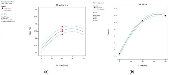 For analysing the relationships between variables and providing a quantitative illustration of how certain parameters impact responses, response surface methodology (RSM) is a powerful technique [40]. The Box–Behnken Design (BBD) method is one of the RSM techniques used to examine the significant effect of process factors on the response [41]. It also studies interactions between the factors to analyse the impact on the response [42]. The experimental runs were operated based on 4 independent variables, including reaction feed molar ratio of alkene to TBHP, reaction temperature, catalyst loading, and reaction time, which were labelled as A, B, C, and D, respectively. Three levels for each variable were coded as −1, 0, +1. The yield of 1,2-epoxy-5-hexene and 1,2-epoxy-7-octene was selected as the response for this study. The experiments were finished in a random order to reduce the impact of unexplained inconsistency in the response [43]. Design Expert 13 software (Stat-Ease Inc., Minneapolis, MN, USA) was used to identify and operate experimental design procedures. Twenty-nine runs were carried out randomly, and their responses were determined based on the outcomes of the experiment [44].