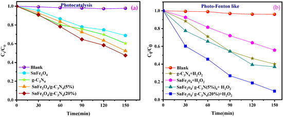 (a) Adsorption of BCB by SnFe2O4/g-C3N4; (b) Fenton-like, photocatalytic, and photo-Fenton-like of BCB in the presence of SnFe2O4/gC3N4.