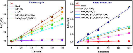 Figure 9a,b shows the plots of Ln (Ct/C0) versus irradiation time for the photocatalytic and photo-Fenton-like degradation of BCB, respectively, while the reaction rate constants are illustrated in Figure 9c,d. The rate constants for the photo-Fenton-like processes (0.0069, 0.00123, 0.01299, and 0.03975 min−1 for SnFe2O4, g-C3N4, SnFe2O4/g-C3N4 (5%), SnFe2O4/g-C3N4 (20%), respectively) are higher than those for the photocatalytic processes (0.00129, 0.00195, 0.00412, and 0.00557 min−1) for all catalysts (Figure 9c,d). It has been demonstrated that the Fenton-like photocatalytic reaction with SnFe2O4/g-C3N4 (20%) exhibits a reaction rate approximately 7.13 times higher than that of the standard photocatalytic reaction.