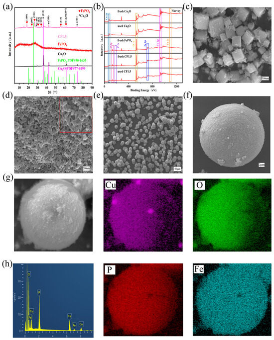 (a) XRD patterns and (b) XPS spectrum of as-prepared samples; SEM images of (c) Cu2O, (d) FePO4, and (e,f) CF1.5; and (g) element mapping of and (h) EDX of CF1.5.