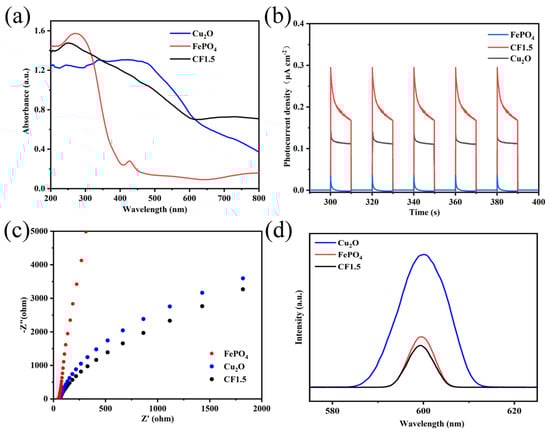 (a) UV–vis DRS spectra; (b) transient photocurrent responses; (c) EIS Nyquist plots; and (d) time-resolved transient photoluminescence (PL) decay curves of as-prepared Cu2O, FePO4, and CF1.5.