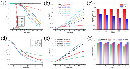 (a) Photodegradation of MB (50 mL, 20 mg/L) by different photocatalysts under visible light irradiation (λ > 420 nm); (b) kinetic linear simulation curves and (c) recycling performance experiments of Cu2O and CF1.5; (d) photodegradation of TC and CR (50 mL, 20 mg/L) by CF1.5 and Cu2O photocatalysts; (e) kinetic linear simulation curves; and (f) recycling performance experiments of CF1.5.
